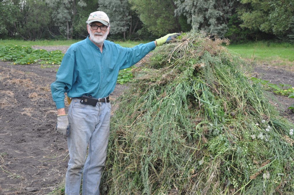 Fr. Lawrence stands beside the large pile of weeds that once covered his garden.