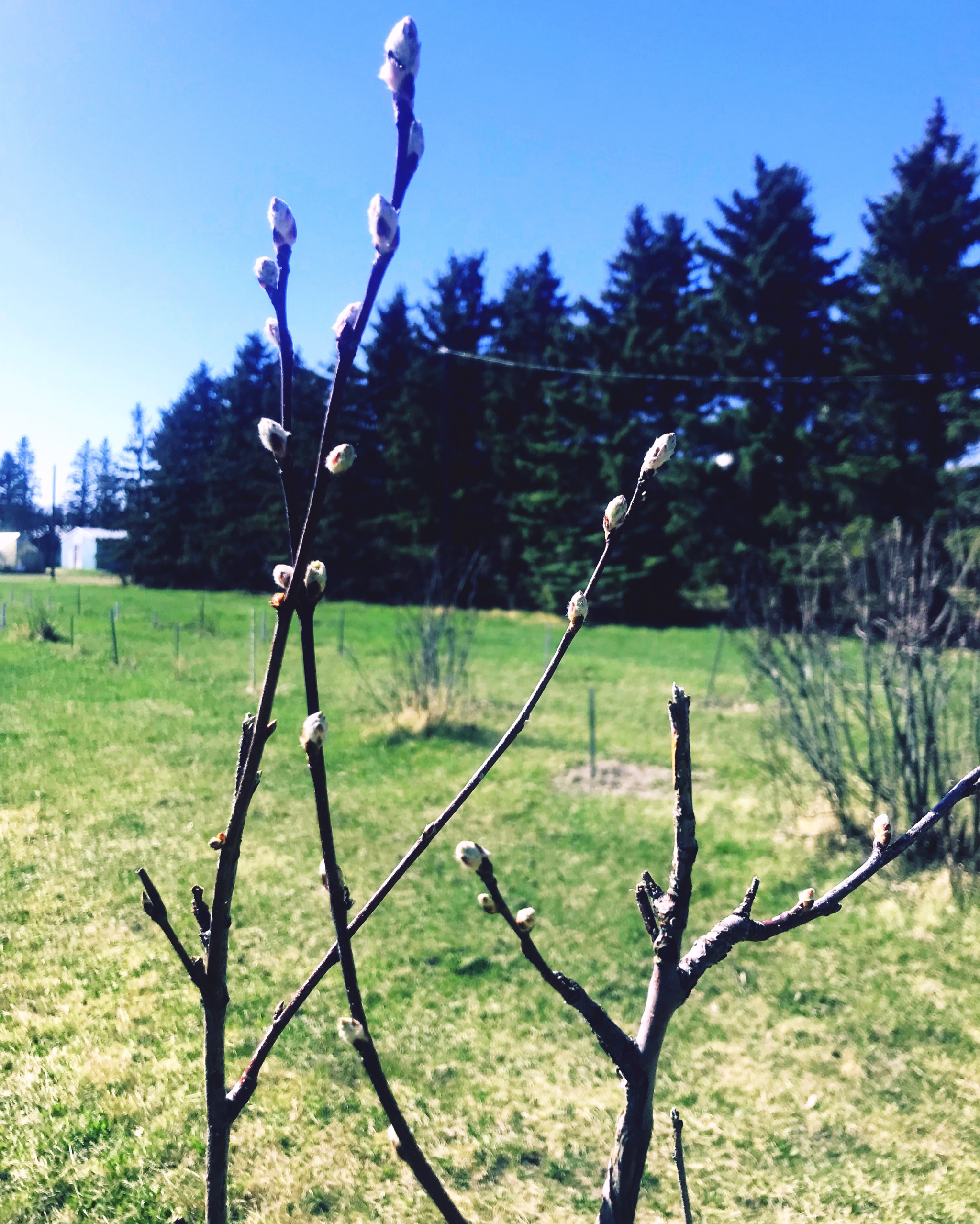 It is early May and our Saskatoon bushes appear to be showing signs of buds that are greening.  We look forward to harvesting in late June or early July.  Last fall we did some major pruning of the bushes.