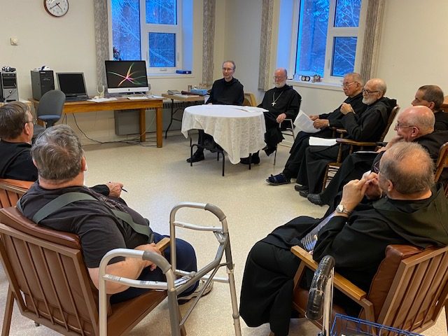 Two monks from the United States visited St Peter’s Abbey Nov. 11-14 to conduct a visitation. The visitors were Prior Bradley Jenniges of St. John’s Abbey (Minnesota), centre left, and Abbot Placid Solari of Belmont Abbey (North Carolina). A visitation is a periodic examination of monastic life as lived at St. Peter’s. They discussed their report with the community on Sunday afternoon, Nov. 14.