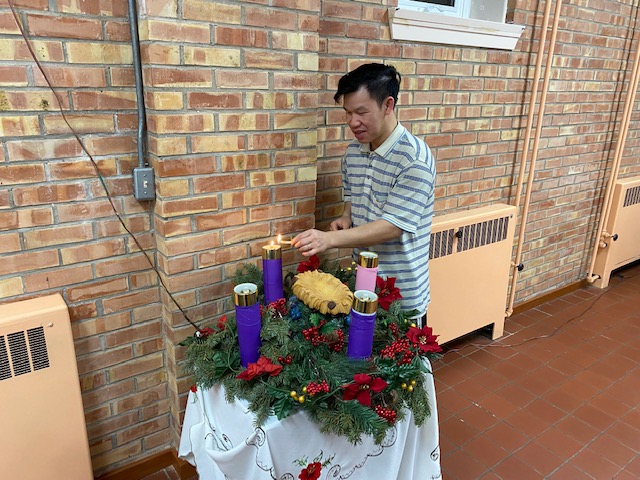 Each Advent season the abbey community celebrates with an Advent wreath in the dining room. Joseph Do lights the candle for the first week of Advent on Saturday, Nov. 27.