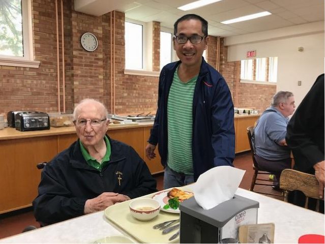 Br. Luis helps Fr. Joe get his food ready to eat at dinner in the abbey dining room.