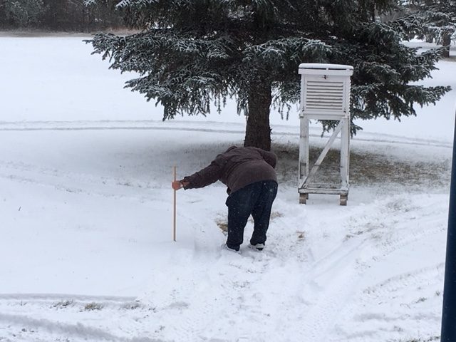 Brother Pierre measures the amount of snow that fell the morning of Nov. 4.
