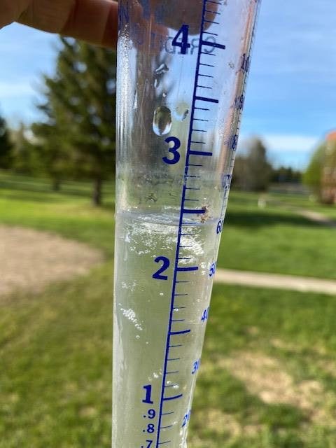 A beautiful spring rain that started on May 23, Pentecost Sunday, ended a spring drought in Saskatchewan. Farmers and gardeners are rejoicing. This rain gauge shows the amount of rain at the Abbey which also resulted in a slight frost the morning of May 26.